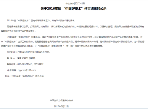 關(guān)于2016年度“中國好技術(shù)”評審結(jié)果公示