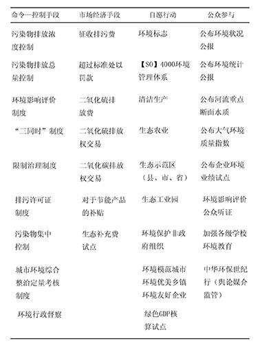 關(guān)于我國(guó)環(huán)境治理的實(shí)踐過(guò)程,張坤民等(2007) 建立了包栝命令—控制手段、經(jīng)濟(jì)刺激手段和公眾參與或稱自愿手段等多樣化的環(huán)境政策工具矩陣。見(jiàn)表2.1