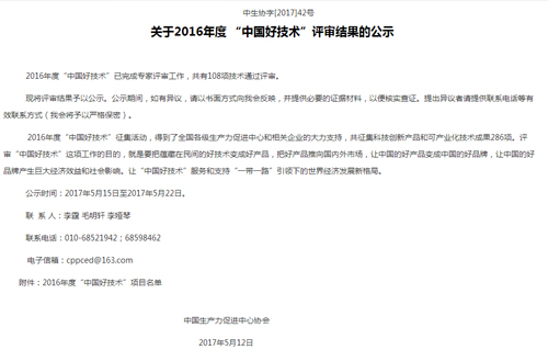 “中國好技術(shù)”是為深入貫徹落實黨中央、國務(wù)院關(guān)于實施創(chuàng)新驅(qū)動發(fā)展戰(zhàn)略和“大眾創(chuàng)業(yè)、萬眾創(chuàng)新”的精神,不斷激發(fā)全社會的創(chuàng)新創(chuàng)業(yè)活力,營造全民創(chuàng)新的良好氛圍,由中國生產(chǎn)力促進中心協(xié)會同國家相關(guān)機構(gòu)和企業(yè)共同發(fā)起和舉辦的,此獎項評選為每年一次。在2016年度“中國好技術(shù)”征集中,得到了全國各級生產(chǎn)力促進中心和相關(guān)企業(yè)的大力支持,共征集科技創(chuàng)新產(chǎn)品和可產(chǎn)業(yè)化技術(shù)成果286項,獲得“中國好技術(shù)”稱號有108個項目。評審“中國好技術(shù)”這項工作的目的,就是要把蘊藏在民間的好技術(shù)變成好產(chǎn)品,把好產(chǎn)品推向國內(nèi)外市場,讓中國的好產(chǎn)品變成中國的好品牌,讓中國的好品牌產(chǎn)生巨大經(jīng)濟效益和社會影響。讓“中國好技術(shù)”服務(wù)和支持“一帶一路”引領(lǐng)下的世界經(jīng)濟發(fā)展新格局,讓“中國好技術(shù)”走出國門,走向世界。