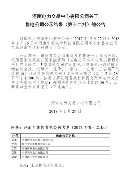 日前,河南電力交易中心發(fā)布了關(guān)于售電公司公示結(jié)果(第十二批)的公告,公告中稱,于2017年12月27日至2018年1月26日對(duì)河南中恒電力科技有限公司等5家售電公司注冊(cè)申請(qǐng)材料進(jìn)行了公示,未收到異議,注冊(cè)手續(xù)自動(dòng)生效。