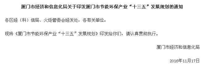 廈門市經(jīng)濟(jì)和信息化局關(guān)于印發(fā)廈門市節(jié)能環(huán)保產(chǎn)業(yè)“十三五”發(fā)展規(guī)劃的通知: