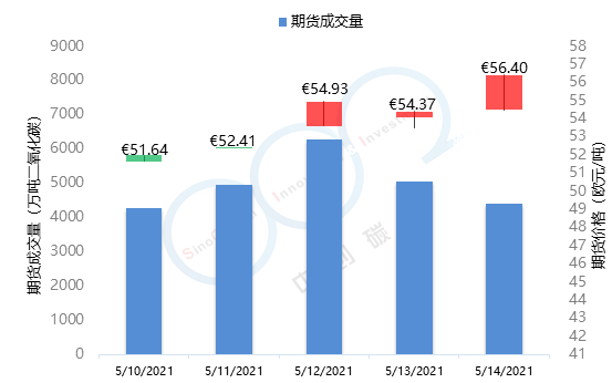 - 2021年5月10日至5月14日,由于歐盟碳市場投資者的強勢買盤以及歐盟氣候負責人對于歐盟碳價較為消極的干預(yù)政策,歐盟碳價在本周再次呈現(xiàn)較大漲幅并接連刷新記錄,由51.64歐元/噸上漲至56.40歐元/噸,漲幅達9.22%。