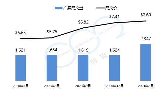 RGGI碳市場的初始配額發(fā)放以拍賣為主,每個季度舉行一次拍賣。2021年第一季度拍賣成交均價為$7.60美元,較上一季度漲幅為2.5%。由于弗吉尼亞州的加入,RGGI總成交量創(chuàng)歷史新高,達到了2347萬噸。以下是由中創(chuàng)碳投統(tǒng)計的RGGI近一年的交易情況。