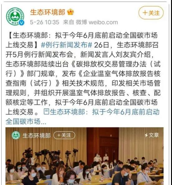 26日?據(jù)生態(tài)環(huán)境部官方微博消息,擬于今年6月底前啟動(dòng)全國碳市場(chǎng)上線交易。