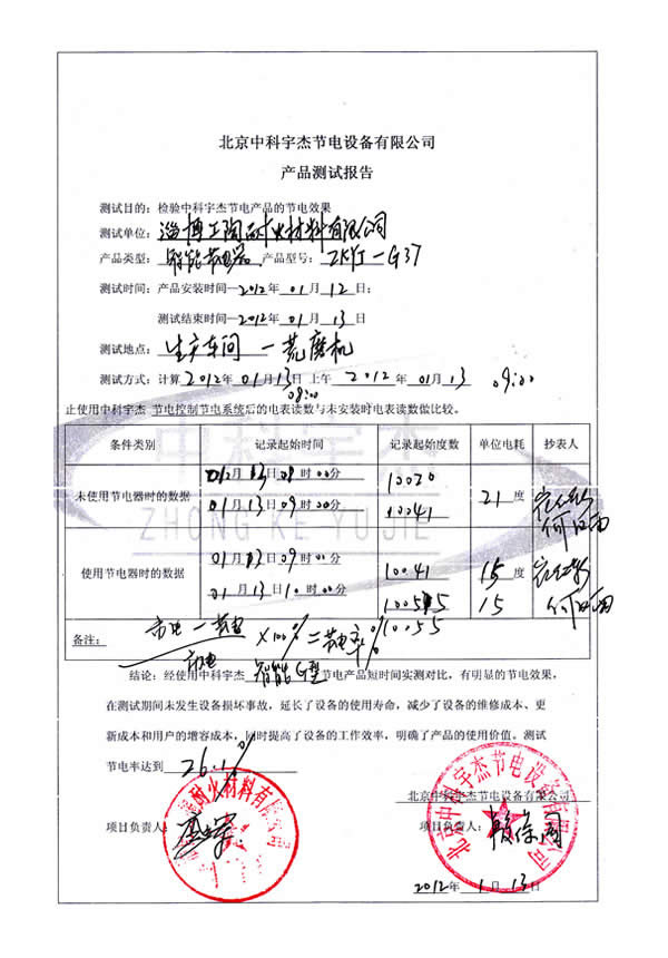 經(jīng)過我們公司工程師的分析,有較大的節(jié)電空間,經(jīng)測試安裝,幾臺設(shè)備的節(jié)電效果分別達到21.7%、25.9%、26.1%和40%。投資回報期1.5年。